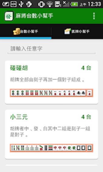 Na przykład, jeśli gracz wpisze "莊" (bankier), aplikacja wyświetli wyniki związane z bankierem, takie jak "莊家" (bankier), "連莊" (kolejny bankier) i "拉莊" (ciągnięcie bankiera). Podobnie, jeśli gracz wpisze liczbę "2", aplikacja pokaże wyniki takie jak "平胡" (zwykła ręka), "全求" (wszystkie chows i pungs) i "花槓" (kwiatowy kong) dla odniesienia.